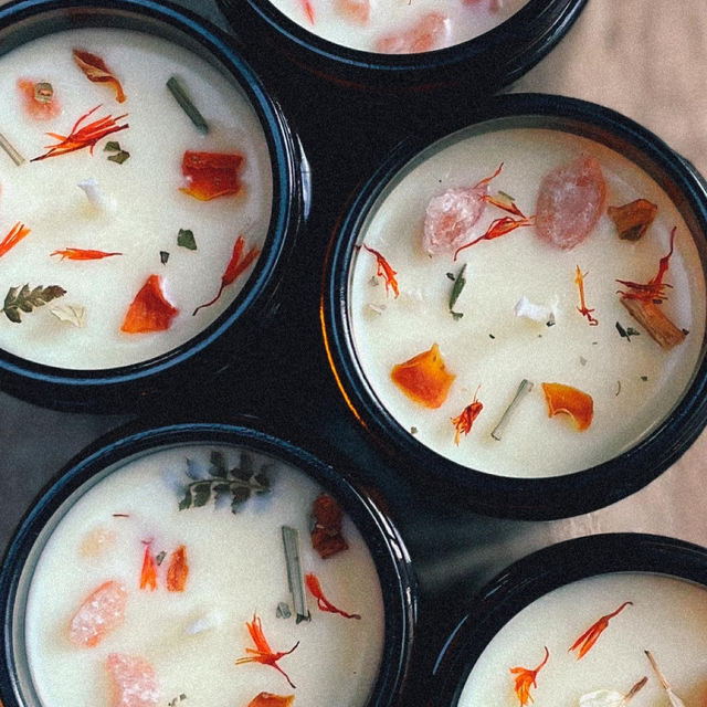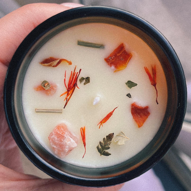 Each Candle is hand-poured with love in small batches using vegan friendly soy wax, cotton wicks and infused with high quality essential oils. Finished and adorned with a crystal and dried flowers.